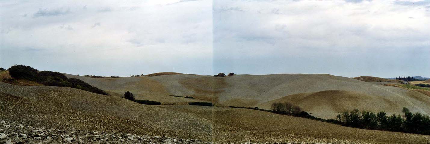 Mi sveglio e riparto di buon ora dopo aver pagato il campeggio e aver ricaricato la moto di tutti i bagagli. Il tempo comincia a guastarsi e io gia' mi vedo viaggiare verso Siena sotto una pioggia battente, completamente zuppo per non aver preso niente in caso di pioggia. Il cielo e' veramente nero e cominciano a cadere alcune gocce. Mi fermo a Monteriggioni per un caffe', una visita veloce ed alcune fotografie. Passo quindi per Siena senza pero' fermarmi prendendo la statale 438 in direzione Asciano. Che dire di questa statale? E' semplicemente incredibile visto che attraversa una zona stranissima: le crete senesi. Volete capire di cosa parlo? Eccovi sopra un paio di foto esplicative. Dopo una visita ad Asciano mi dirigo verso l'Abbazia di monte Oliveto Maggiore dove mangio qualche cosa, visito, mi riposo un attimo e faccio un paio di telefonate a mia cugina per mettermi d'accordo sul luogo dell'appuntamento. Alle 18 circa sono a Buonconvento dove finalmente incontro mia cugina Michelle ma sono in anticipo di almeno un'ora. Come se niente fosse mi "accampo" alle porte di Buonconvento, bevo il resto del mio bibitone Isostad eee…. cazzeggio per mezzoretta salutando a piu' non posso tutti i bikers che passano. L'incontro con Michelle e' decisamente mitico: lei arriva con una Peugeot con targa francese e io gia' ho il sospetto che i giorni seguenti saranno molto molto particolari. Dopo una bella chiaccherata scopro che mia cugina partecipa come assistente ad un workshop di fotografia che si sta tenendo vicino a Buonconvento. Tra un "oh" e l'altro, scopro che i corsi di fotografia si tengono in un castello medioveale e che gli studenti e assistenti sono ospitati in un agriturismo con tanto di piscina. Beh, l'idea di parassitarmi in questo ambiente mi gasa alquanto. Senza farlo apposta scopro di essere arrivato giusto giusto (che caso, eh?) per la festa finale in onore degli studenti che quella settimana hanno terminato i corsi. Tra una tartina e l'altra mia cugina mi fa sapere che sono presenti all'abbuffata Kent Robertseen, il direttore della fotografia del National Geographic nonche' vari fotografi "da paura" tra i quali David A. Harvey e molti altri ancora. Finito il mega rinfresco tutti al pub li vicino (TNT pub) dove scatta la gara di tequila Bum Bum alla quale, a mio malincuore, decido di rinunciare per la salvezza del mio stomaco. E' ora di andare a dormire ….zzzzzzzzzz