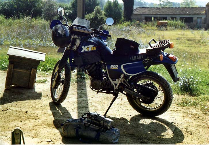 Una foto alla moto poco prima di partire. Notate, sopra la tenda, la mitica bottiglia isoterimica fatta in casa.